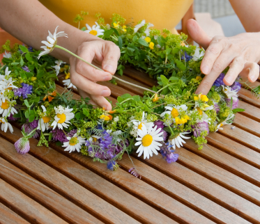 Für einen eigenen Kranz braucht Ihr Birken- und Eichenlaub, Kornblumen und Margariten oder einfach Wildblumen.