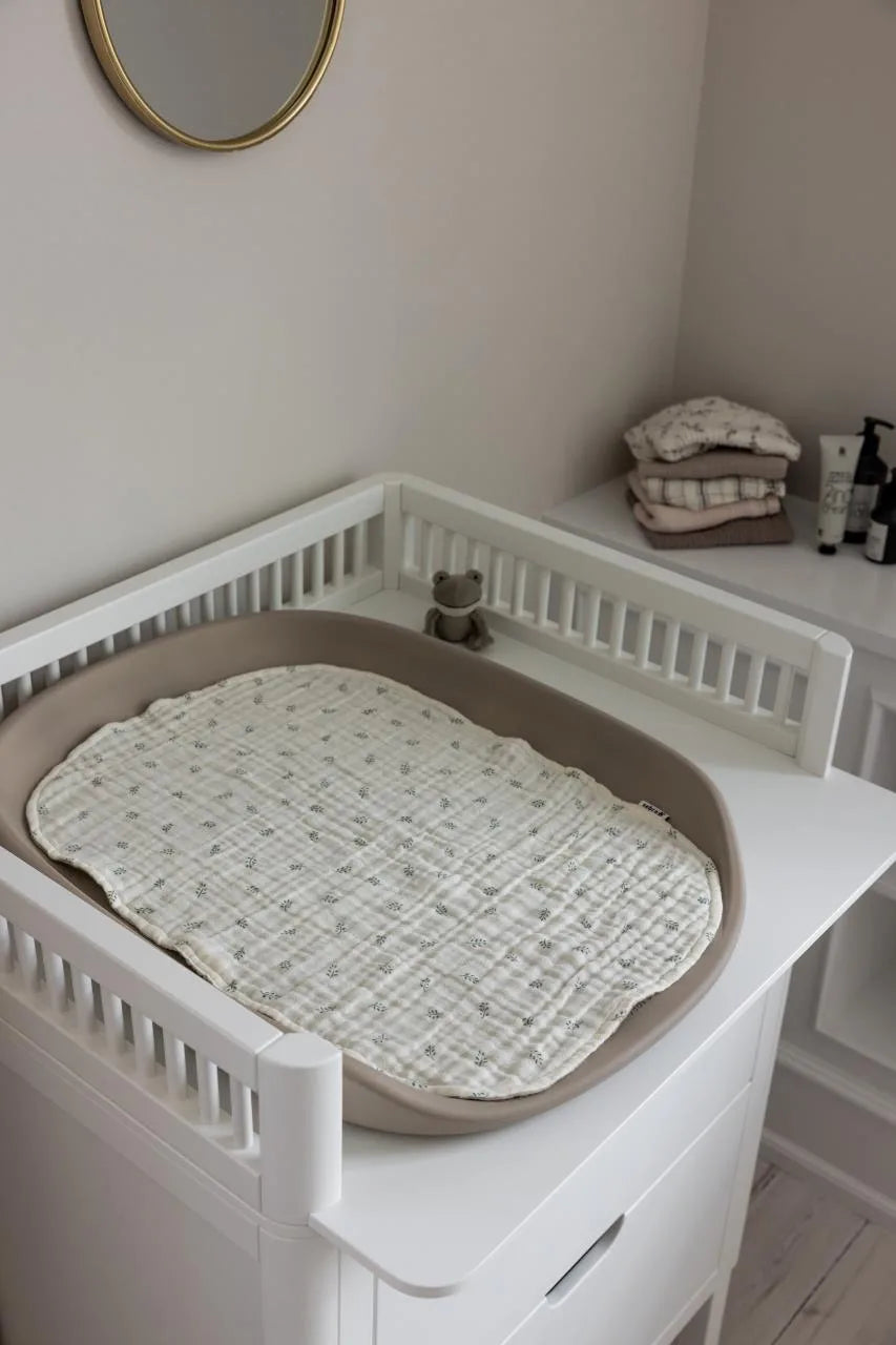 Auf der einen Seite zeigt sich die Unterlage in einem ruhigen Seabreeze Beige, auf der anderen im liebevoll gestalteten Sophora-Leaves-Muster. So lässt sich der Look je nach Stimmung oder Einrichtung variieren. Der weiche Stoff bildet eine schützende Schicht zwischen Baby und Wickelkissen und macht den Wickelmoment besonders gemütlich. Dank der Waschbarkeit bei 60 °C ist die Unterlage hygienisch, pflegeleicht und jederzeit einsatzbereit – ein funktionales und stilvolles Zubehör für den Wickelplatz.