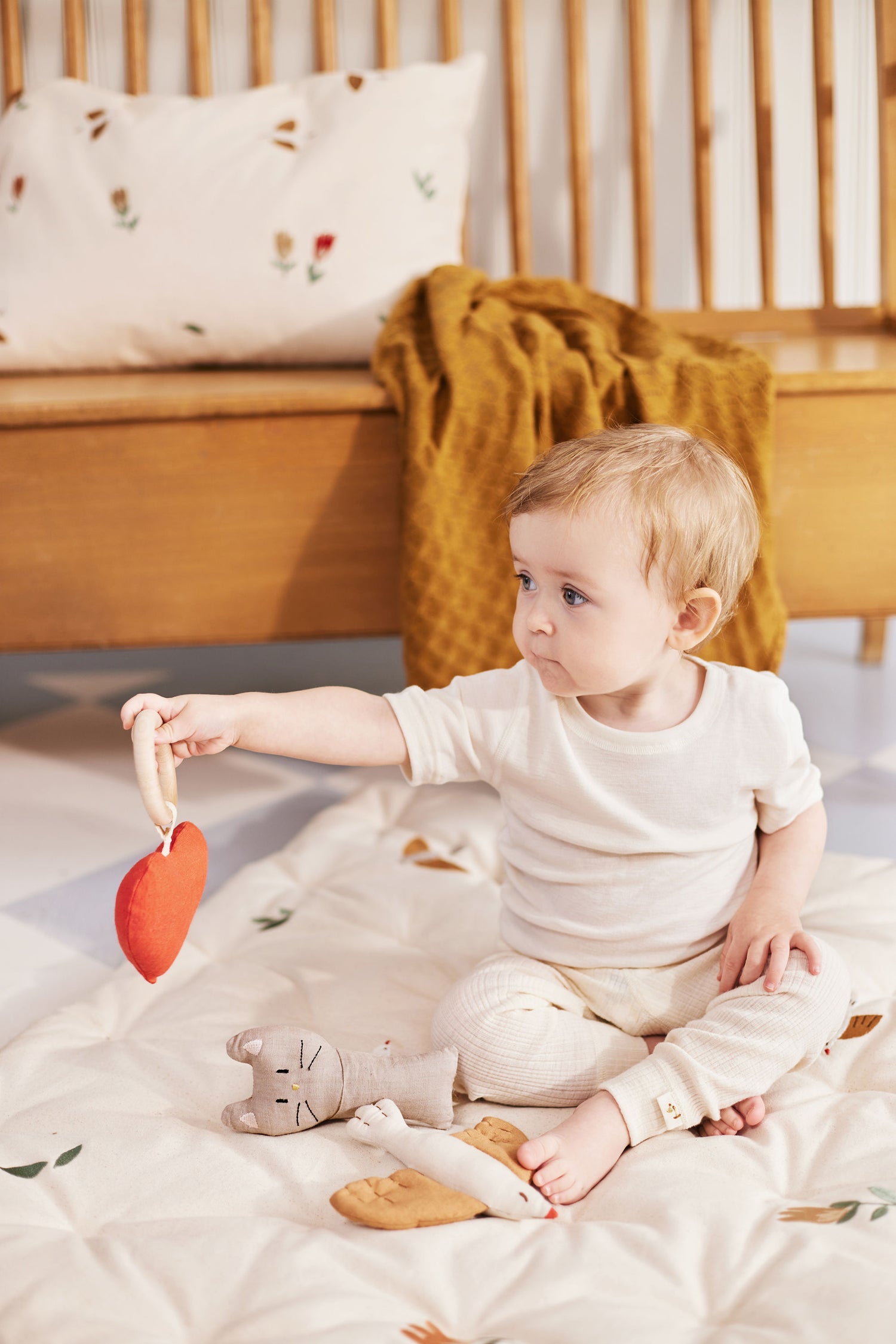 Im Inneren des Herzens befindet sich eine kleine Glocke, die bei Bewegung ein zartes Klingeln erzeugt und die Sinne Deines Kindes spielerisch stimuliert. Ein wunderschönes Accessoire, das sich ideal als erstes Spielzeug oder kleines Geschenk eignet.