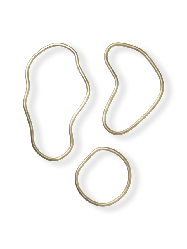 Das Pond Trivets Set von Ferm Living bringt Eleganz und Funktionalität auf den Esstisch. Inspiriert von den organischen Formen bewegten Wassers, bestehen die drei Untersetzer aus massivem Messing mit einer matten Politur. Sie schützen den Tisch vor heißen Töpfen und Pfannen und können bei Nichtgebrauch dekorativ an einem Haken aufgehängt werden. Durch die natürliche Materialbeschaffenheit entwickelt das Messing mit der Zeit eine charaktervolle Patina, die den einzigartigen Look unterstreicht.