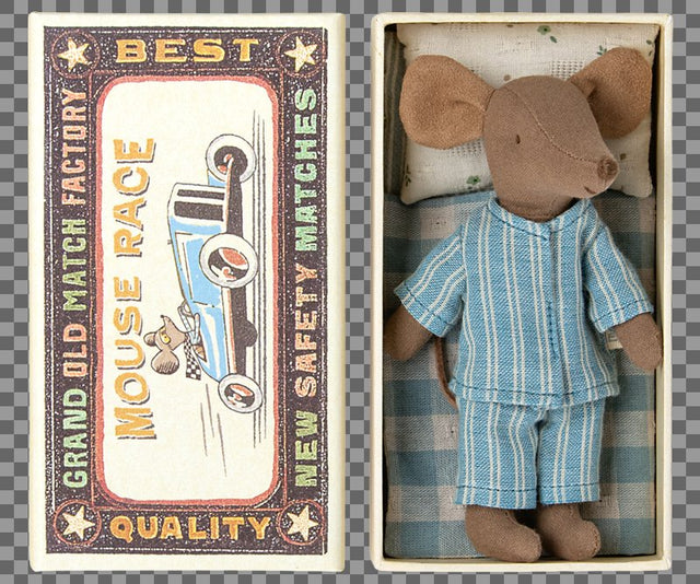 Maileg grosser Bruder Maus in Streichholzschachtel – mit stilvoller Kleidung und schöner Bettwäsche.