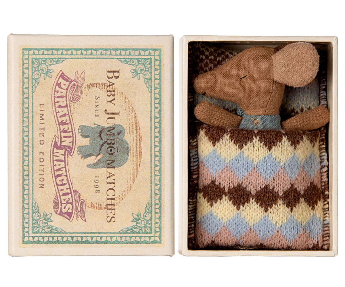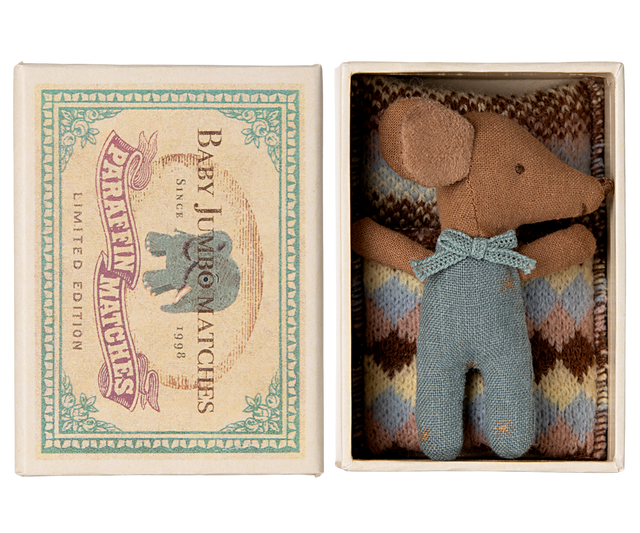 Die Sleepy Wakey Baby Maus – Blau ist ein bezaubernder Maileg-Klassiker! Diese niedliche Maus schläft auf der einen Seite friedlich und ist auf der anderen Seite wach – ideal für fantasievolle Geschichten und kreatives Spielen. Sie kommt in einer kleinen, charmanten Streichholzschachtel, ausgestattet mit weicher Bettwäsche in schönen Blautönen. Ein liebevoll gestaltetes Accessoire, das die Maileg-Welt bereichert und Kinderherzen höherschlagen lässt.
