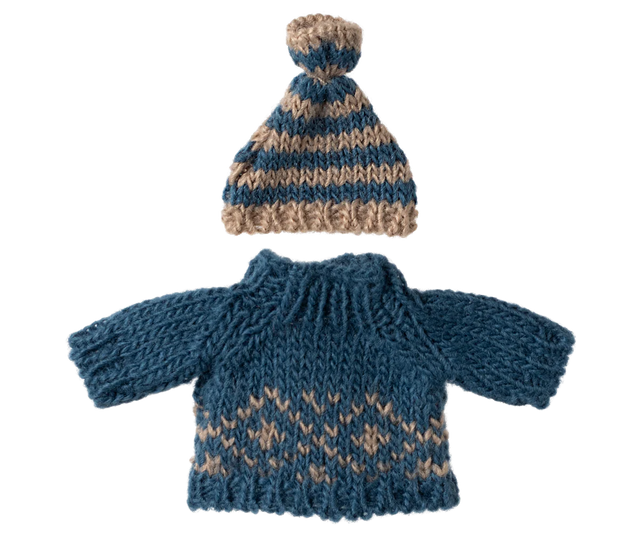 Dieser weiche Strickpullover mit passender Mütze bringt winterliche Gemütlichkeit in die Maileg-Welt und ist ideal für Papa Maus. Das Muster ist inspiriert von traditionellen skandinavischen Strickkünsten und verleiht dem Outfit eine besonders heimelige Note. Die kleine Mütze hält die Ohren warm und macht das Set perfekt für kalte Tage im Mäusehaus. Der Pullover passt nicht nur Papa Maus, sondern auch Mama, Oma und Opa – ein vielseitiges, liebevolles Accessoire für jede Maileg-Szene.