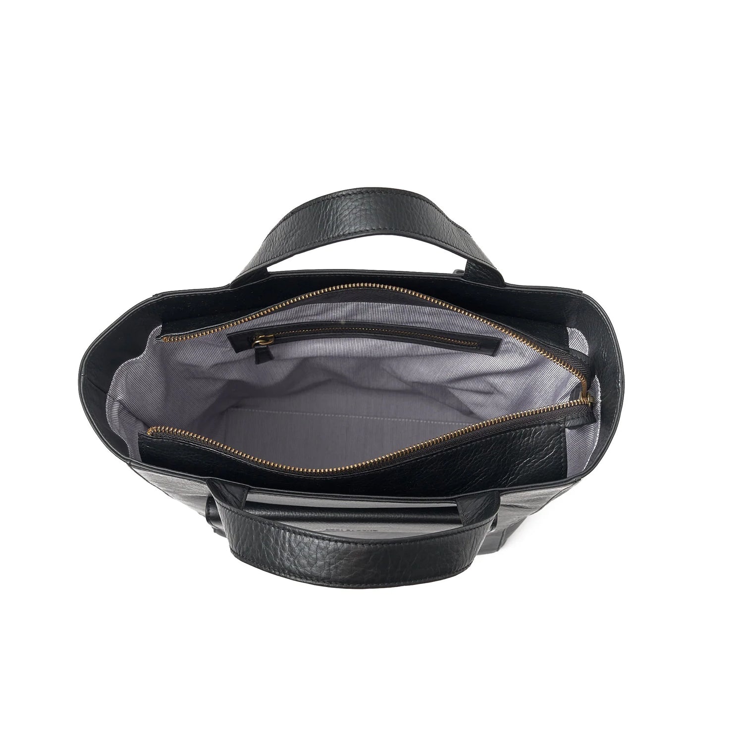 Zeitloser Leder-Rucksack in Schwarz mit Reissverschluss, Fronttasche und durchdachter Innenaufteilung für den Alltag.