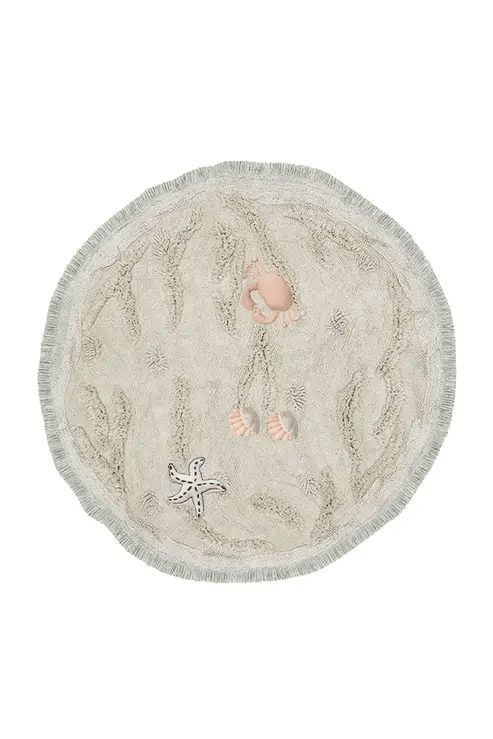 Als besonderes Highlight enthält der Teppich vier handgefertigte Textilspielzeuge – einen Strandeimer, einen Seestern, eine Krabbe und zwei Muscheln. Diese liebevoll gestalteten Accessoires regen die Fantasie an und machen das Spielen noch interaktiver.
