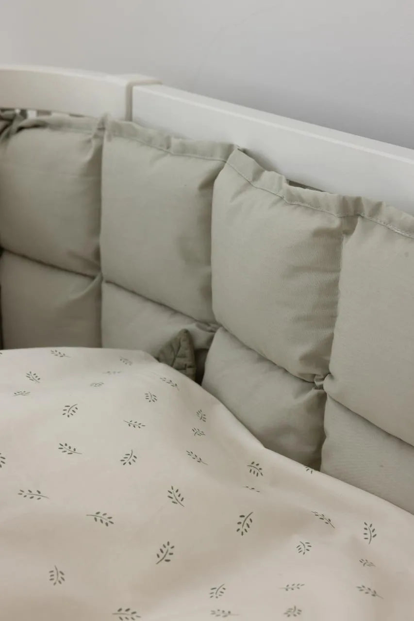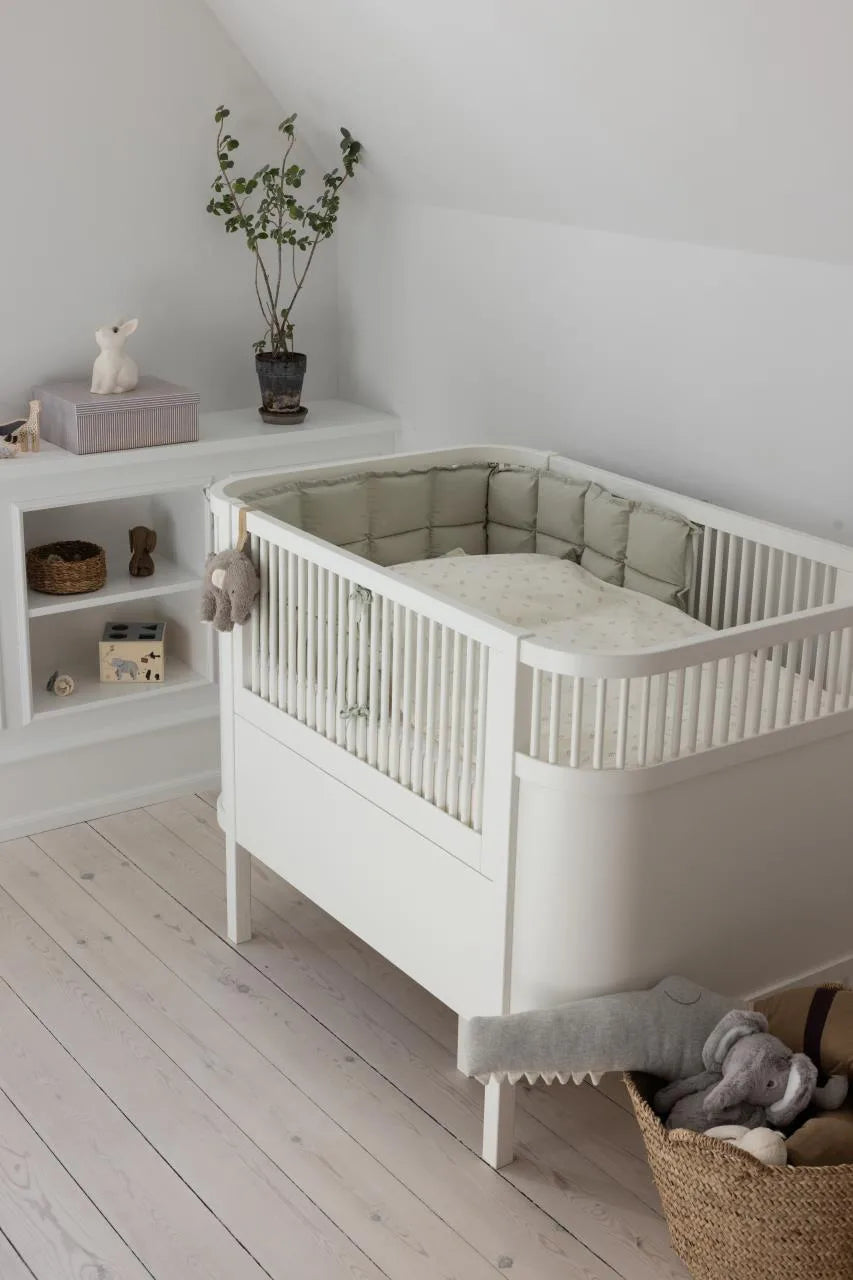 Dank der feinen Bindebänder lässt sich das Bettnestchen sowohl oben als auch unten sicher am Gitterbett befestigen. Die Farbe Mist Green wirkt ruhig, natürlich und zeitlos und lässt sich wunderbar mit Sebra Bettwäsche, Spannleintüchern und Betthimmeln kombinieren.