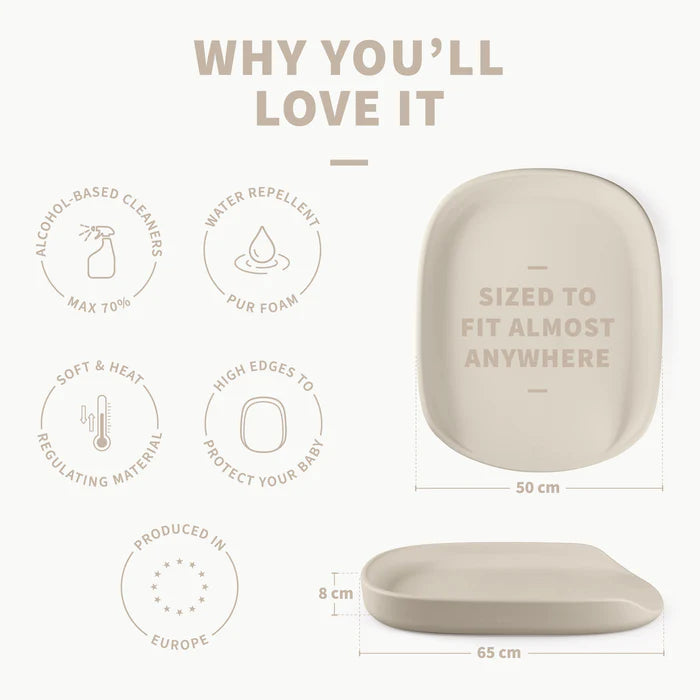 Die Wickelmatte Pusle Pur in Straw Beige bietet eine weiche, wasserabweisende Oberfläche und hohe Kanten für maximale Sicherheit und Komfort beim Wickeln. Aus langlebigem, stoßdämpfendem PUR gefertigt.