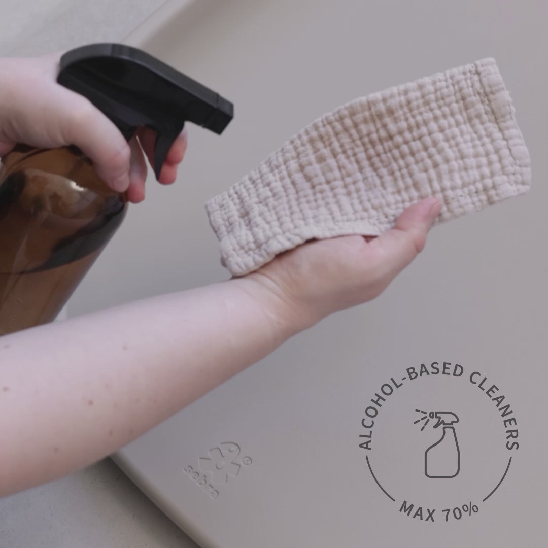 Die geschlossene, wasserabweisende Oberfläche ist besonders hygienisch und pflegeleicht. Die Wickelmatte lässt sich einfach mit Wasser und Seife reinigen, mit bis zu 70 % Alkohol desinfizieren oder sogar unter der Dusche abspülen. Das langlebige PUR-Material bleibt dabei formstabil, weich und schön – auch bei täglichem Gebrauch über viele Jahre hinweg.
