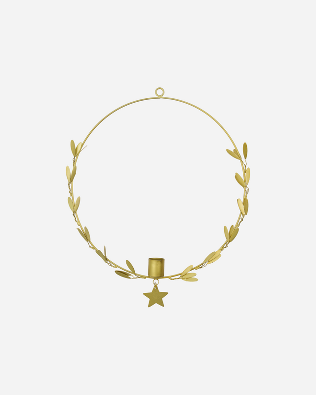 Der hängende Kerzenhalter HDMistel von House Doctor verbindet festlichen Charme mit stilvollem Design und ist die perfekte Lösung für gemütliche Weihnachtsbeleuchtung – ganz ohne Tischfläche. Gefertigt aus robustem Eisen und veredelt mit einem edlen Messing-Finish, präsentiert sich der Kerzenhalter als eleganter Ring, dekoriert mit feinen Blättern und einem kleinen Stern. Er lässt sich mit einem Band dekorativ aufhängen und setzt besonders in Ecken oder Fenstern wunderschöne Lichtakzente. Kombiniert mit einer LED-Stabkerze entsteht ein stimmungsvoller Blickfang, der Wärme und weihnachtliche Atmosphäre ins Zuhause bringt. Für eine persönliche Note kannst du den Ring zusätzlich mit kleinen Zweigen, Eukalyptus oder feinem Schmuck verzieren. Ein stilvolles Highlight für jedes Interior – dezent, edel und vielseitig dekorierbar.