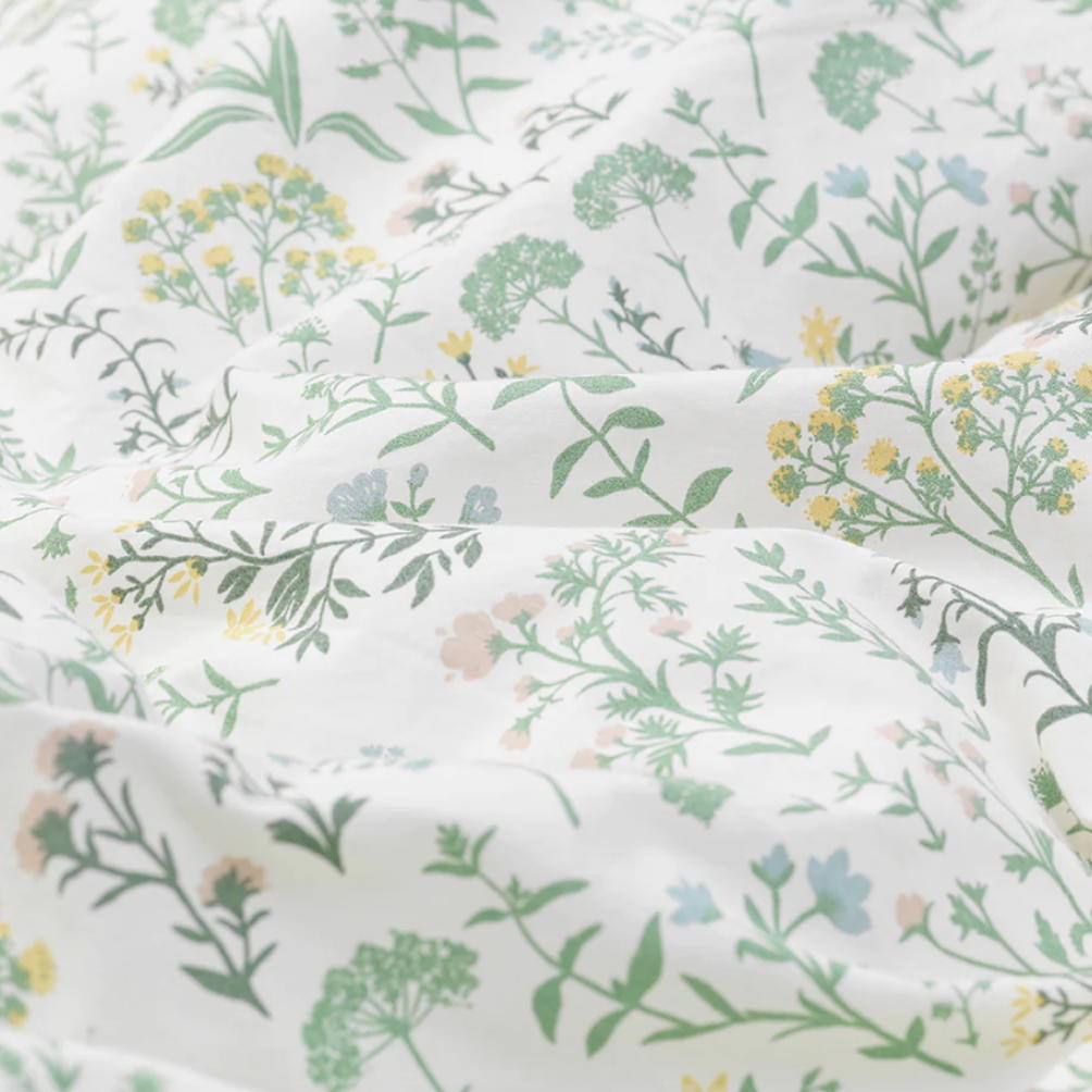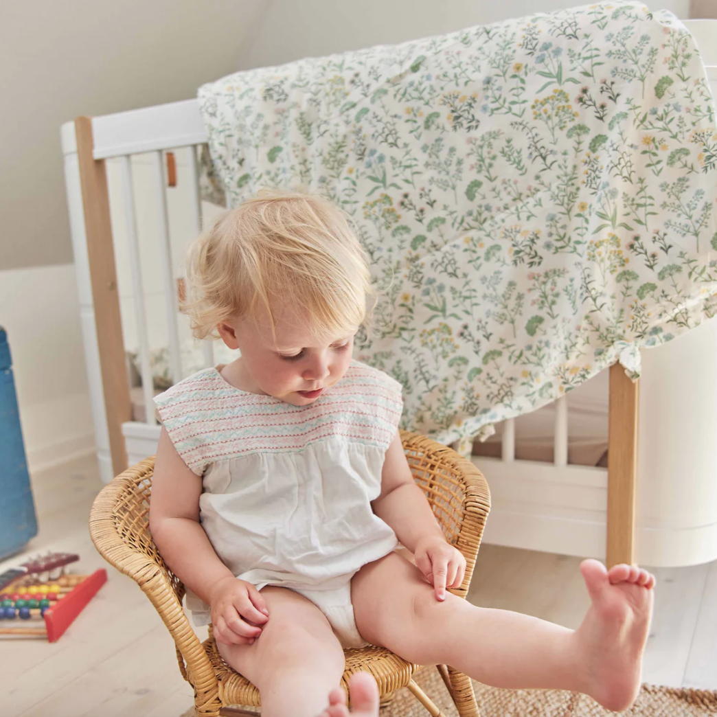 Soft baby bedding from Dear April made from 100% organic cotton percale. The dense percale weave is not only durable and beautiful to look at, but also light and breathable. The bedding is pre-washed, which gives it a naturally crinkled look and makes it incredibly soft - the more you use it, the softer it becomes. The pillowcase has a zipper, while the duvet cover closes with elegant ties. Summer floral print is a timeless classic that is a little nostalgic but never goes out of style.