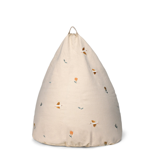 Sitzsack Songbirds aus nachhaltigem, ungefärbtem Canvas mit Stickereien von Vögeln, Blättern und Blumen. Stilvoll, praktisch und bequem – für Kinder und Eltern.