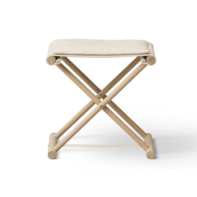Der Hocker ist aus massiver, weiss geölter Eiche, Canvas aus Bio-Baumwolle und recyceltem Polyester gefertigt.