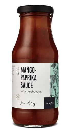 Die Mango-Paprika Sauce von Wajos vereint süsse Mango, fruchtige Paprika und scharf-würzige Jalapeño-Chilies zu einer exotischen Geschmacksexplosion. Perfekt für Grillgerichte, Fleisch, Gemüse, Reis und Kartoffeln. Auch als Zutat für Saucen und Dressings sorgt sie für eine unvergleichlich würzige Frische. Besonders köstlich zu hellem Fleisch und in Gemüsepfannen!