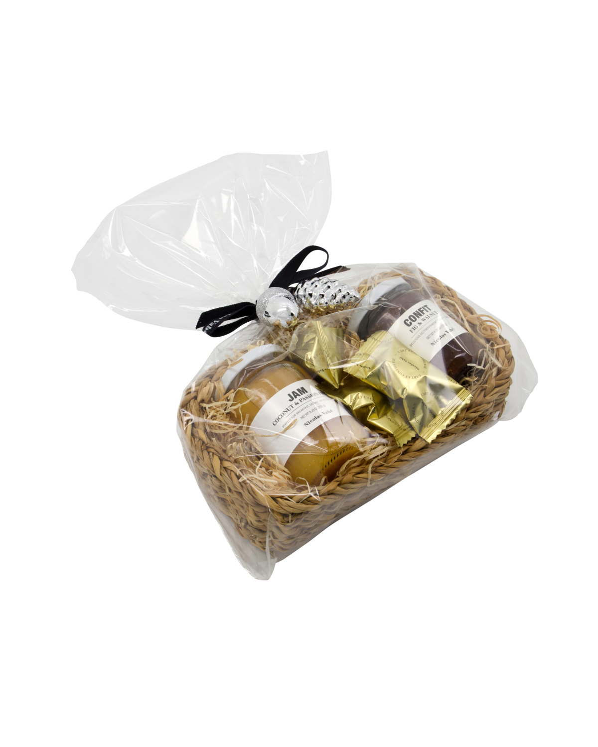 Präsentkorb mit feiner Konfitüre und herzhaftem Confit – stilvoll verpackt und perfekt als Geschenk für Genießer. Jetzt im Wohnreich bestellen und kulinarische Freude verschenken!