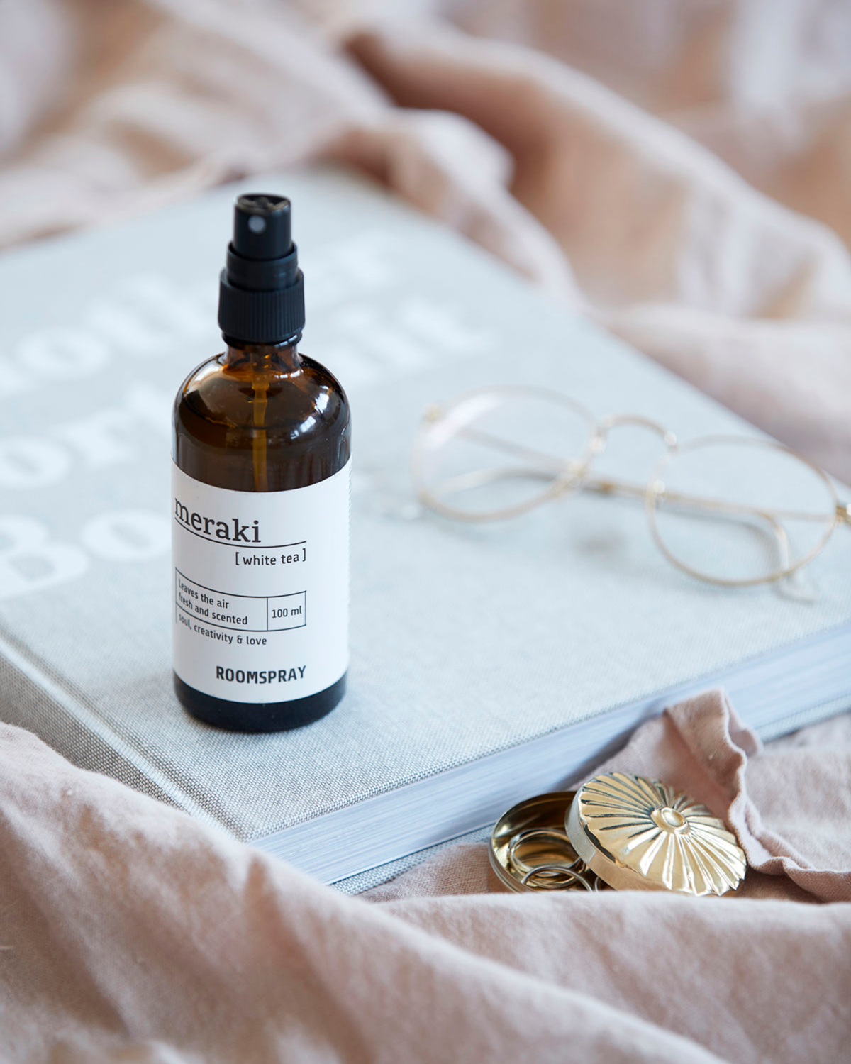 Meraki Roomspray White Tea 100 ml – elegantes Raumspray mit feinen Noten von Tee, Bergamotte, Sandelholz und Tonkabohne für eine entspannte Atmosphäre.