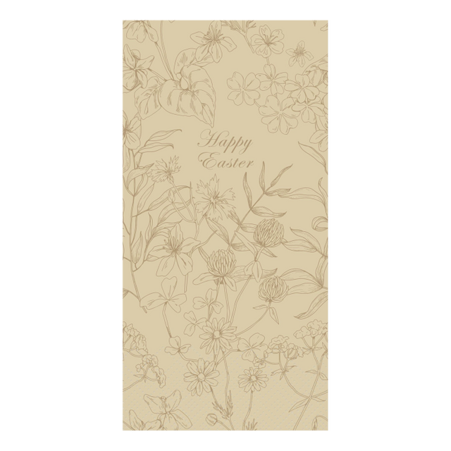Die Servietten mit Blumenmuster "Happy Easter" in Honigfarbe bringen Wärme und Eleganz auf Ihren Ostertisch. Mit einer großzügigen Größe von 40 x 40 cm (aufgefaltet) und einer 3-lagigen Papierqualität überzeugen sie durch Stabilität und angenehme Haptik. Das liebevolle Blumenmuster in einem sanften Honigton sorgt für eine fröhliche und einladende Atmosphäre – ideal für Ihre Osterfeier oder ein gemütliches Frühstück.